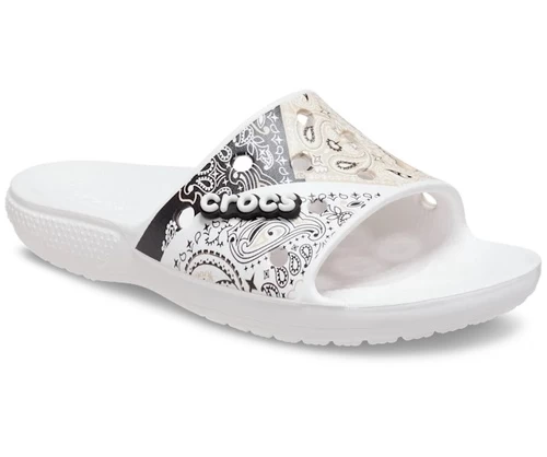 The Classic Crocs Bandana Slide features street-inspired bandana print graphics.